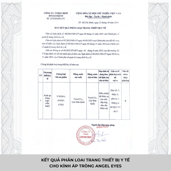 Angel Eyes là đơn vị nhập khẩu và phân phối kính áp tròng chính hãng từ Hàn Quốc tại Việt Nam, có giấy chứng nhận của Bộ Y Tế Việt Nam theo Nghị định 98/2021/NĐ-CP. Hệ thống showroom trải dài từ TPHCM (Phú Nhuận, Thủ Đức), đến Bình Dương, Cần Thơ, Gia Lai, Phan Rang và Hà Nội.